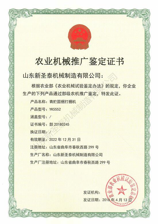 山東新圣泰機(jī)械制造有限公司,2018年YK5552型青貯圓捆打捆機(jī)獲得農(nóng)機(jī)推廣鑒定證書(證書編號:部20180245),進(jìn)入國家農(nóng)機(jī)補(bǔ)貼目錄,為廣大農(nóng)戶和農(nóng)業(yè)生產(chǎn)合作社購買打捆機(jī)享受到了國家農(nóng)機(jī)補(bǔ)貼,更為農(nóng)機(jī)經(jīng)銷商提高了產(chǎn)品的市場競爭力。
