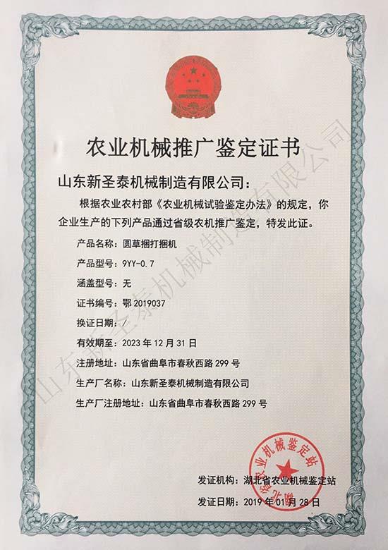 進(jìn)入2019年,山東新圣泰又有一款撿拾打捆機(jī)產(chǎn)品獲得農(nóng)機(jī)推廣鑒定證書(證書編號:鄂2019037),具有了享受國家農(nóng)機(jī)購置補(bǔ)貼的資格,該產(chǎn)品為9YY-0.7型圓草捆打捆機(jī),為拖拉機(jī)牽引式,撿拾幅寬1.8m。至此,山東新圣泰以上兩款產(chǎn)品今年均可以享受國家農(nóng)機(jī)產(chǎn)品購置補(bǔ)貼,為直接購機(jī)客戶帶來了福音,也為廣大經(jīng)銷商增加了經(jīng)銷產(chǎn)品的選擇余地。山東新圣泰將一如既往,弘揚(yáng)工匠精神,生產(chǎn)制造符合國家標(biāo)準(zhǔn)的優(yōu)質(zhì)產(chǎn)品,為廣大客戶提供周到貼心的服務(wù)。