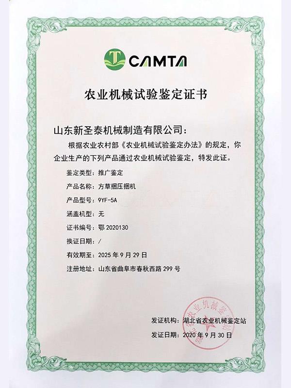 由山東新圣泰機械制造有限公司研發(fā)制造的9YF-5A方草捆壓捆機(又稱套袋打包機),近期通過湖北省農(nóng)機鑒定站的推廣鑒定,獲得農(nóng)業(yè)機械鑒定證書(證書編號:鄂2020130).作為服務(wù)“三農(nóng)”和秸稈綜合利用的專用設(shè)備,該機擁有國家實用新型專利證書,這次再獲得推廣鑒定證書,充分證明了該機的可靠性、適用性。待投檔進入補貼目錄后,將為廣大購機客戶節(jié)省一筆不小的購機費用,享受到國家農(nóng)機補貼產(chǎn)品的優(yōu)惠政策。